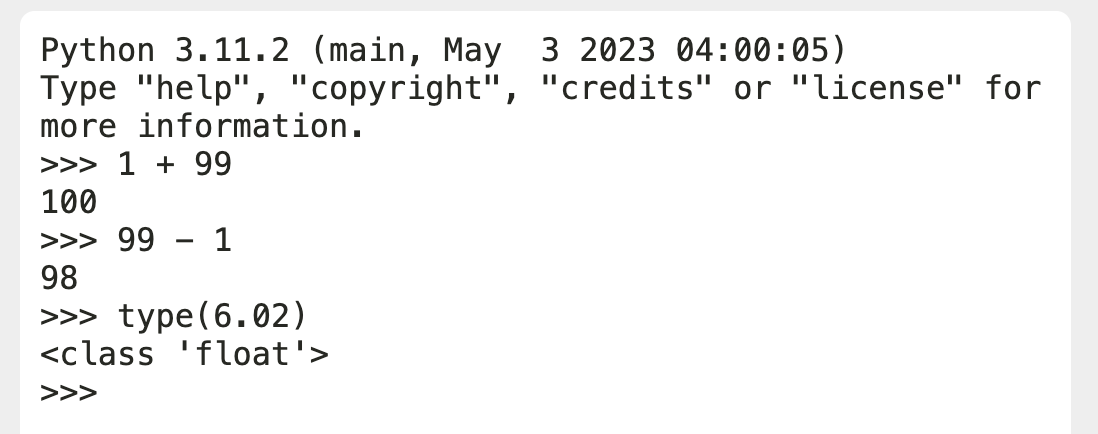 - Quels sont les 4 types simples en python que vous avez vus dans ce chapitre? (int: entier, float: flottant, …)