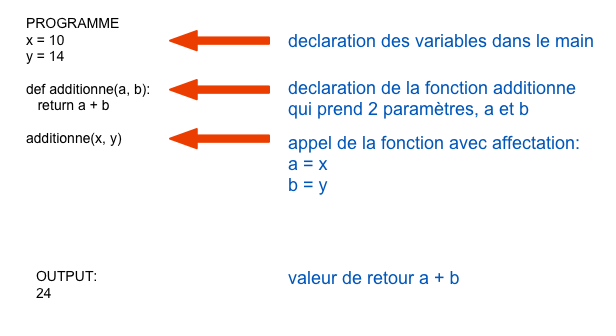 Les variables déclarées avec la fonction, entre parenthèse sont appelées paramètres. Le schéma suivant illustre l’affectation des valeurs des variables a = x