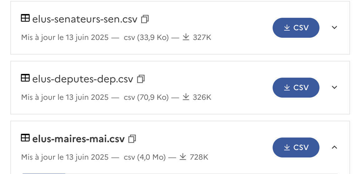 En bas de page, trouver la rubrique elus-maires-mai.csv. Cliquer sur le bouton pour telecharger le document.